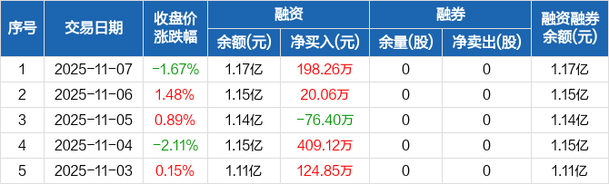 融资方面,当日融资买入708.25万元,融资偿还509.99万元,融资净买入198.26万元。融券方面,融券卖出0股,融券偿还0股,融券余量0股,融券余额0元。融资融券余额合计1.17亿元。