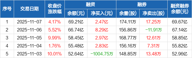 融资方面,当日融资买入25亿元,融资偿还22.53亿元,融资净买入2.47亿元,净买入额两市排名第12,连续4日净买入累计16.57亿元。融券方面,融券卖出21.46万股,融券偿还4.21万股,融券余量174.11万股,融券余额4613.84万元。融资融券余额合计69.67亿元。