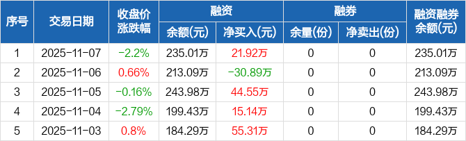 融资方面,当日融资买入87.06万元,融资偿还65.14万元,融资净买入21.92万元。融券方面,融券卖出0份,融券偿还0份,融券余量0份,融券余额0元。融资融券余额合计235.01万元。