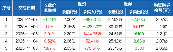 融资方面,当日融资买入2613.39万元,融资偿还3500.4万元,融资净偿还887.01万元。融券方面,融券卖出0股,融券偿还7.5万股,融券余量22.62万股,融券余额90.48万元。融资融券余额合计2.07亿元。