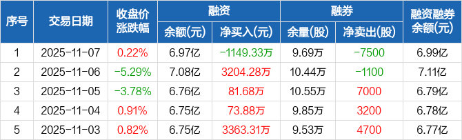 融资方面,当日融资买入3780.61万元,融资偿还4929.94万元,融资净偿还1149.33万元。融券方面,融券卖出0股,融券偿还7500股,融券余量9.69万股,融券余额264.54万元。融资融券余额合计6.99亿元。