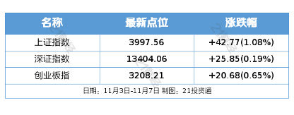 过去一周(11月3日—11月7日),A股三大指数全线上涨。截至11月7日收盘,沪指报3997.56点,周涨1.08%;深成指报13404.06点,周涨0.19%;创业板指报3208.21点,周涨0.65%。
