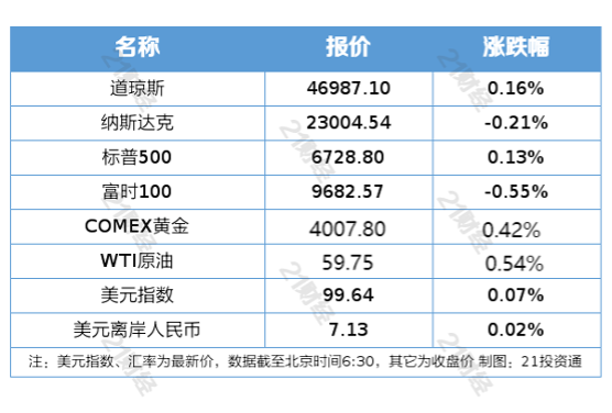 纽约股市三大股指11月7日涨跌不一。截至11月7日收盘,道琼斯工业平均指数比前一交易日上涨74.80点,收于46987.10点,涨幅为0.16%;标准普尔500种股票指数上涨8.48点,收于6728.8点,涨幅为0.13%;纳斯达克综合指数下跌49.46点,收于23004.54点,跌幅为0.21%。