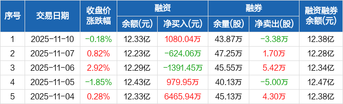 融资方面,当日融资买入4201.95万元,融资偿还3121.91万元,融资净买入1080.04万元。融券方面,融券卖出5300股,融券偿还3.91万股,融券余量43.87万股,融券余额483.01万元。融资融券余额合计12.38亿元。