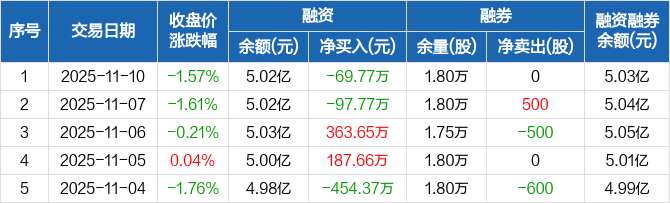 融资方面,当日融资买入1289.85万元,融资偿还1359.62万元,融资净偿还69.77万元。融券方面,融券卖出0股,融券偿还0股,融券余量1.8万股,融券余额134.85万元。融资融券余额合计5.03亿元。