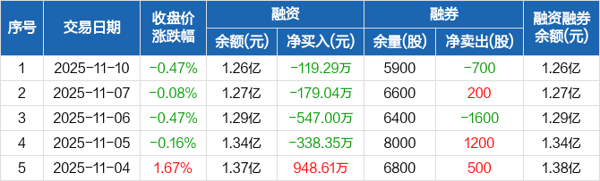 融资方面,当日融资买入1824.23万元,融资偿还1943.52万元,融资净偿还119.29万元,连续4日净偿还累计1183.68万元。融券方面,融券卖出100股,融券偿还800股,融券余量5900股,融券余额7.46万元。融资融券余额合计1.26亿元。