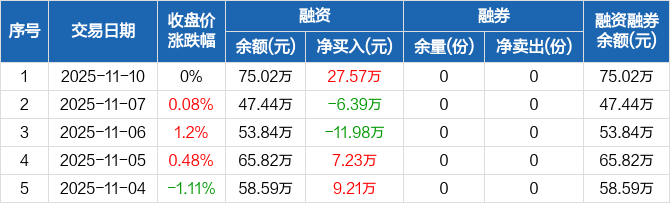 融资方面,当日融资买入55.8万元,融资偿还28.22万元,融资净买入27.57万元。融券方面,融券卖出0份,融券偿还0份,融券余量0份,融券余额0元。融资融券余额合计75.02万元。