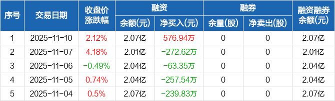 融资方面,当日融资买入3276.82万元,融资偿还2699.88万元,融资净买入576.94万元。融券方面,融券卖出0股,融券偿还0股,融券余量0股,融券余额0元。融资融券余额合计2.07亿元。