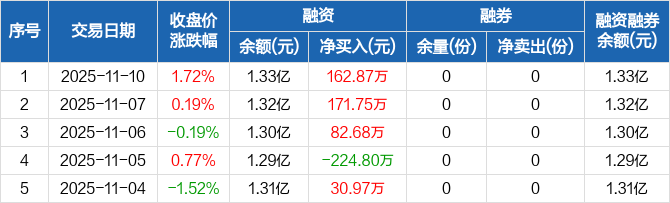 融资方面,当日融资买入2532.59万元,融资偿还2369.73万元,融资净买入162.87万元,连续3日净买入累计417.29万元。融券方面,融券卖出0份,融券偿还0份,融券余量0份,融券余额0元。融资融券余额合计1.33亿元。