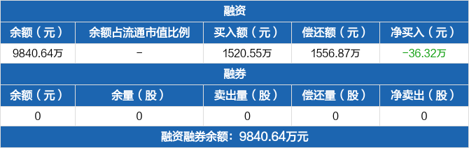 融资方面,当日融资买入1520.55万元,融资偿还1556.87万元,融资净偿还36.32万元。融券方面,融券卖出0份,融券偿还0份,融券余量0份,融券余额0元。融资融券余额合计9840.64万元。