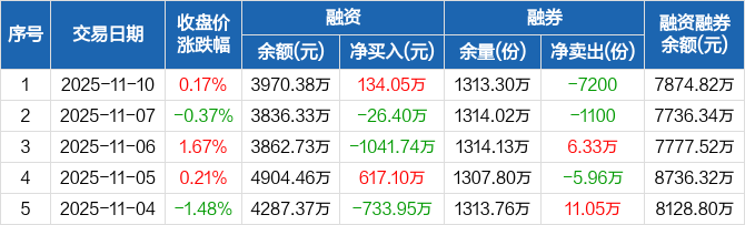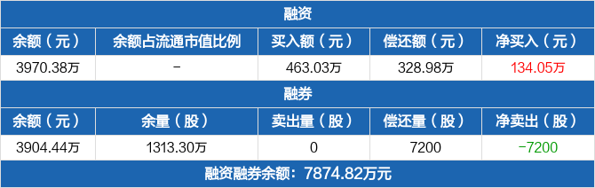 融资方面,当日融资买入463.03万元,融资偿还328.98万元,融资净买入134.05万元。融券方面,融券卖出0份,融券偿还7200份,融券余量1313.3万份,融券余额3904.44万元。融资融券余额合计7874.82万元。