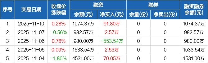 融资方面,当日融资买入337.99万元,融资偿还246.19万元,融资净买入91.8万元。融券方面,融券卖出0份,融券偿还0份,融券余量0份,融券余额0元。融资融券余额合计1074.37万元。