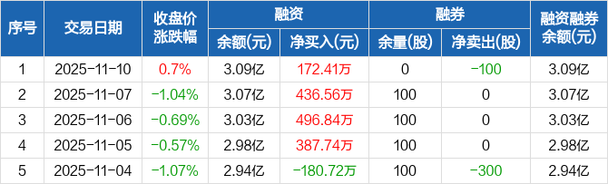 融资方面,当日融资买入856.81万元,融资偿还684.4万元,融资净买入172.41万元,连续4日净买入累计1493.54万元。融券方面,融券卖出0股,融券偿还100股,融券余量0股,融券余额0元。融资融券余额合计3.09亿元。