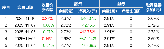 融资方面,当日融资买入907.97万元,融资偿还1454.04万元,融资净偿还546.07万元。融券方面,融券卖出0股,融券偿还0股,融券余量2.91万股,融券余额21.42万元。融资融券余额合计2.67亿元。