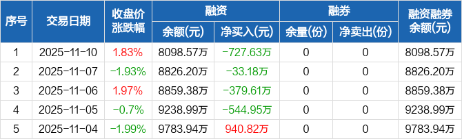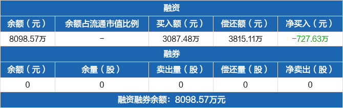 融资方面,当日融资买入3087.48万元,融资偿还3815.11万元,融资净偿还727.63万元,连续4日净偿还累计1685.37万元。融券方面,融券卖出0份,融券偿还0份,融券余量0份,融券余额0元。融资融券余额合计8098.57万元。