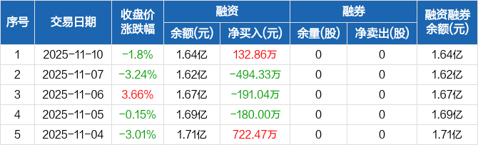 融资方面,当日融资买入1438.57万元,融资偿还1305.71万元,融资净买入132.86万元。融券方面,融券卖出0股,融券偿还0股,融券余量0股,融券余额0元。融资融券余额合计1.64亿元。