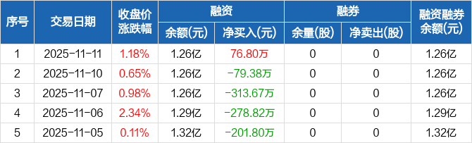 融资方面,当日融资买入603.6万元,融资偿还526.8万元,融资净买入76.8万元。融券方面,融券卖出0股,融券偿还0股,融券余量0股,融券余额0元。融资融券余额合计1.26亿元。