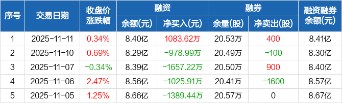 融资方面,当日融资买入2235.48万元,融资偿还1151.87万元,融资净买入1083.62万元。融券方面,融券卖出700股,融券偿还300股,融券余量20.53万股,融券余额120.1万元。融资融券余额合计8.41亿元。