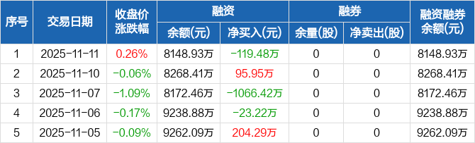 融资方面,当日融资买入154.08万元,融资偿还273.56万元,融资净偿还119.48万元。融券方面,融券卖出0股,融券偿还0股,融券余量0股,融券余额0元。融资融券余额合计8148.93万元。