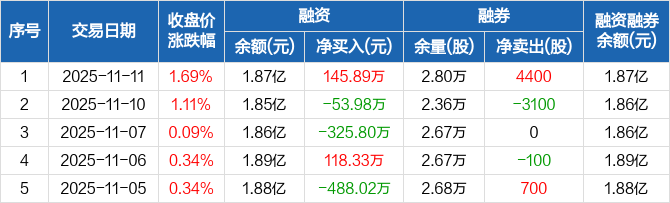 鲁阳节能融资融券信息显示,2025年11月11日融资净买入145.89万元;融资余额1.87亿元,较前一日增加0.79%。
