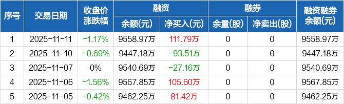 融资方面,当日融资买入357.54万元,融资偿还245.74万元,融资净买入111.79万元。融券方面,融券卖出0股,融券偿还0股,融券余量0股,融券余额0元。融资融券余额合计9558.97万元。