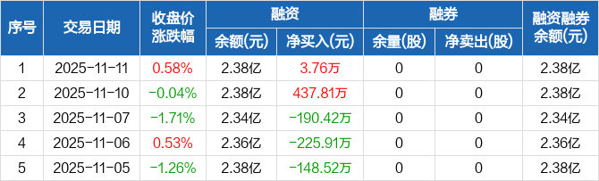 海晨股份融资融券信息显示,2025年11月11日融资净买入3.76万元;融资余额2.38亿元,较前一日增加0.02%