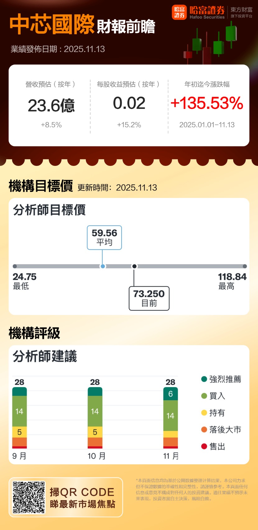 中芯国际(00981.HK)将于11月13日周四公布三季度业绩,市场预期季度营收23.57亿美元,同比增长8.54%。此前公司给出的营收区间为环比增长5%-7%之间,毛利率介于18%至20%之间。