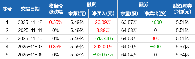 融资方面,当日融资买入3210.91万元,融资偿还3184.53万元,融资净买入26.39万元。融券方面,融券卖出200股,融券偿还1800股,融券余量63.87万股,融券余额184.58万元。融资融券余额合计5.51亿元。