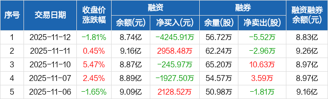 融资方面,当日融资买入8399.01万元,融资偿还1.26亿元,融资净偿还4245.91万元。融券方面,融券卖出9100股,融券偿还6.43万股,融券余量56.72万股,融券余额863.28万元。融资融券余额合计8.83亿元。