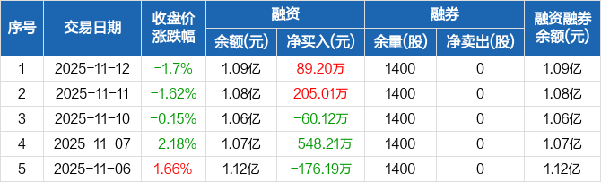 融资方面,当日融资买入503.87万元,融资偿还414.68万元,融资净买入89.2万元。融券方面,融券卖出0股,融券偿还0股,融券余量1400股,融券余额5.59万元。融资融券余额合计1.09亿元。