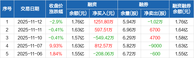 融资方面,当日融资买入2966.66万元,融资偿还1714.85万元,融资净买入1251.8万元。融券方面,融券卖出700股,融券偿还1.09万股,融券余量5.94万股,融券余额27.86万元。融资融券余额合计1.76亿元。