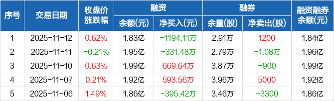 融资方面,当日融资买入1121.64万元,融资偿还2315.74万元,融资净偿还1194.11万元。融券方面,融券卖出1600股,融券偿还400股,融券余量2.91万股,融券余额14.08万元。融资融券余额合计1.84亿元。