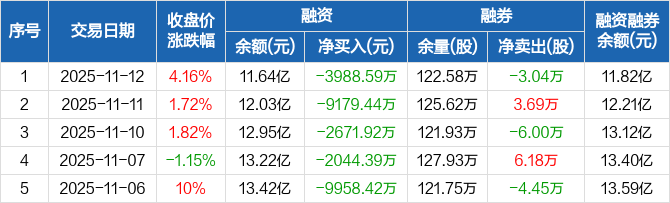 融资方面,当日融资买入3.67亿元,融资偿还4.07亿元,融资净偿还3988.59万元,连续5日净偿还累计2.78亿元。融券方面,融券卖出3.01万股,融券偿还6.05万股,融券余量122.58万股,融券余额1811.73万元。融资融券余额合计11.82亿元。