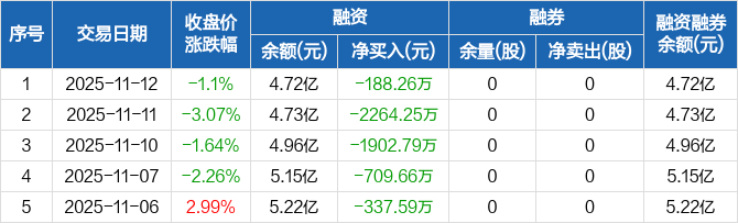 融资方面,当日融资买入2214.73万元,融资偿还2402.99万元,融资净偿还188.26万元,连续7日净偿还累计7631.22万元。融券方面,融券卖出0股,融券偿还0股,融券余量0股,融券余额0元。融资融券余额合计4.72亿元。