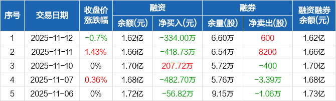 融资方面,当日融资买入712.09万元,融资偿还1046.1万元,融资净偿还334万元。融券方面,融券卖出1300股,融券偿还700股,融券余量6.6万股,融券余额18.61万元。融资融券余额合计1.62亿元。