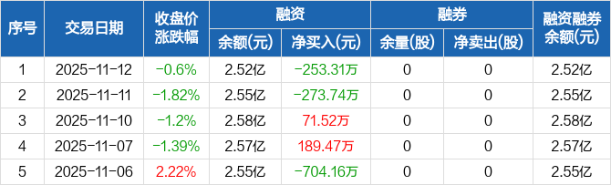 融资方面,当日融资买入960.29万元,融资偿还1213.6万元,融资净偿还253.31万元。融券方面,融券卖出0股,融券偿还0股,融券余量0股,融券余额0元。融资融券余额合计2.52亿元。