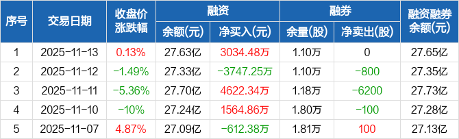 融资方面,当日融资买入1.97亿元,融资偿还1.67亿元,融资净买入3034.48万元。融券方面,融券卖出300股,融券偿还300股,融券余量1.1万股,融券余额219.91万元。融资融券余额合计27.65亿元。