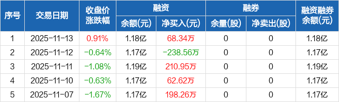 融资方面,当日融资买入561.07万元,融资偿还492.72万元,融资净买入68.34万元。融券方面,融券卖出0股,融券偿还0股,融券余量0股,融券余额0元。融资融券余额合计1.18亿元。