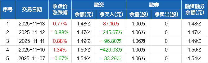 融资方面,当日融资买入474.1万元,融资偿还386.93万元,融资净买入87.16万元。融券方面,融券卖出0股,融券偿还0股,融券余量1.06万股,融券余额9.67万元。融资融券余额合计1.48亿元。