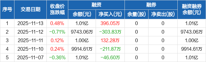 融资方面,当日融资买入717.08万元,融资偿还321.03万元,融资净买入396.05万元。融券方面,融券卖出0股,融券偿还0股,融券余量0股,融券余额0元。融资融券余额合计1.01亿元。