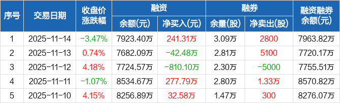 融资方面,当日融资买入1350.63万元,融资偿还1109.32万元,融资净买入241.31万元。融券方面,融券卖出3200股,融券偿还400股,融券余量3.09万股,融券余额40.42万元。融资融券余额合计7963.82万元。