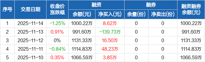 融资方面,当日融资买入124.31万元,融资偿还115.69万元,融资净买入8.62万元。融券方面,融券卖出0份,融券偿还0份,融券余量0份,融券余额0元。融资融券余额合计1000.22万元。