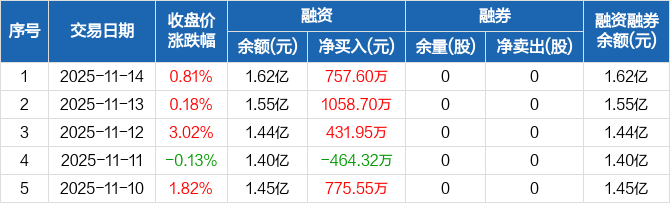 融资方面,当日融资买入4112.08万元,融资偿还3354.48万元,融资净买入757.6万元,连续3日净买入累计2248.25万元。融券方面,融券卖出0股,融券偿还0股,融券余量0股,融券余额0元。融资融券余额合计1.62亿元。