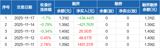 融资方面,当日融资买入492.36万元,融资偿还930.81万元,融资净偿还438.44万元。融券方面,融券卖出0股,融券偿还0股,融券余量0股,融券余额0元。融资融券余额合计1.31亿元。