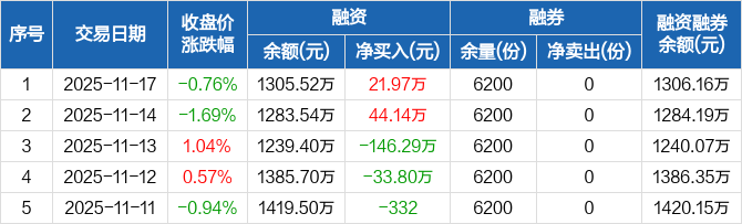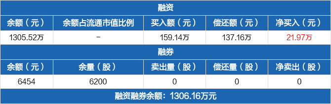 融资方面,当日融资买入159.14万元,融资偿还137.16万元,融资净买入21.97万元。融券方面,融券卖出0份,融券偿还0份,融券余量6200份,融券余额6454元。融资融券余额合计1306.16万元。