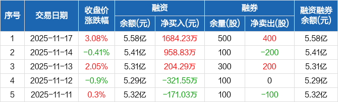 融资方面,当日融资买入6286.67万元,融资偿还4602.43万元,融资净买入1684.23万元,连续3日净买入累计2847.35万元。融券方面,融券卖出500股,融券偿还100股,融券余量500股,融券余额8700元。融资融券余额合计5.58亿元。