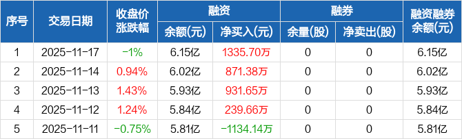 融资方面,当日融资买入2678.74万元,融资偿还1343.03万元,融资净买入1335.7万元,连续4日净买入累计3378.38万元。融券方面,融券卖出0股,融券偿还0股,融券余量0股,融券余额0元。融资融券余额合计6.15亿元。