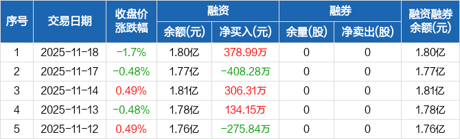 融资方面,当日融资买入1304.99万元,融资偿还926万元,融资净买入378.99万元。融券方面,融券卖出0股,融券偿还0股,融券余量0股,融券余额0元。融资融券余额合计1.8亿元。