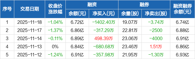 融资方面,当日融资买入2072.55万元,融资偿还3474.95万元,融资净偿还1402.4万元。融券方面,融券卖出3700股,融券偿还4.11万股,融券余量19.07万股,融券余额163.05万元。融资融券余额合计6.74亿元。