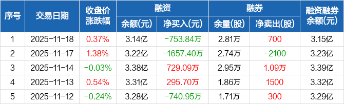 融资方面,当日融资买入894.82万元,融资偿还1648.65万元,融资净偿还753.84万元。融券方面,融券卖出2200股,融券偿还1500股,融券余量2.81万股,融券余额107.4万元。融资融券余额合计3.15亿元。